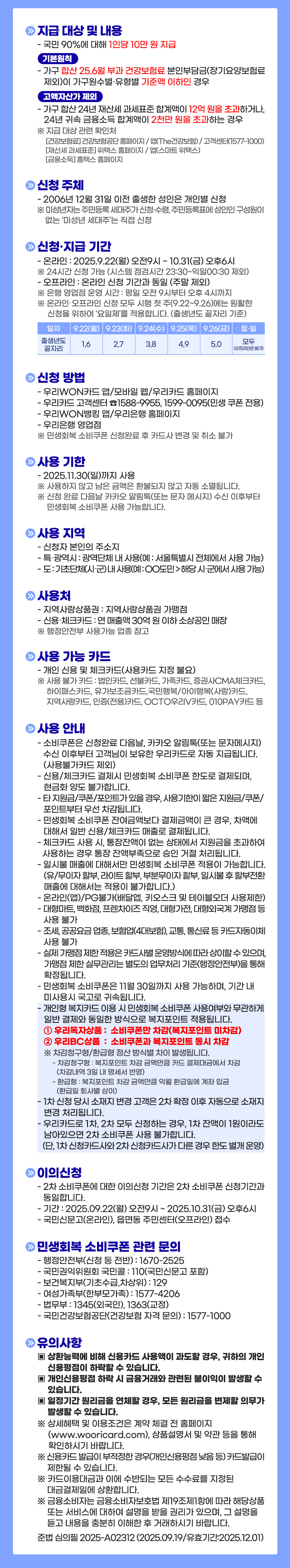 우리카드에서 민생회복 소비쿠폰 관련한 주요 사항을 아래와 같이 안내 드립니다.